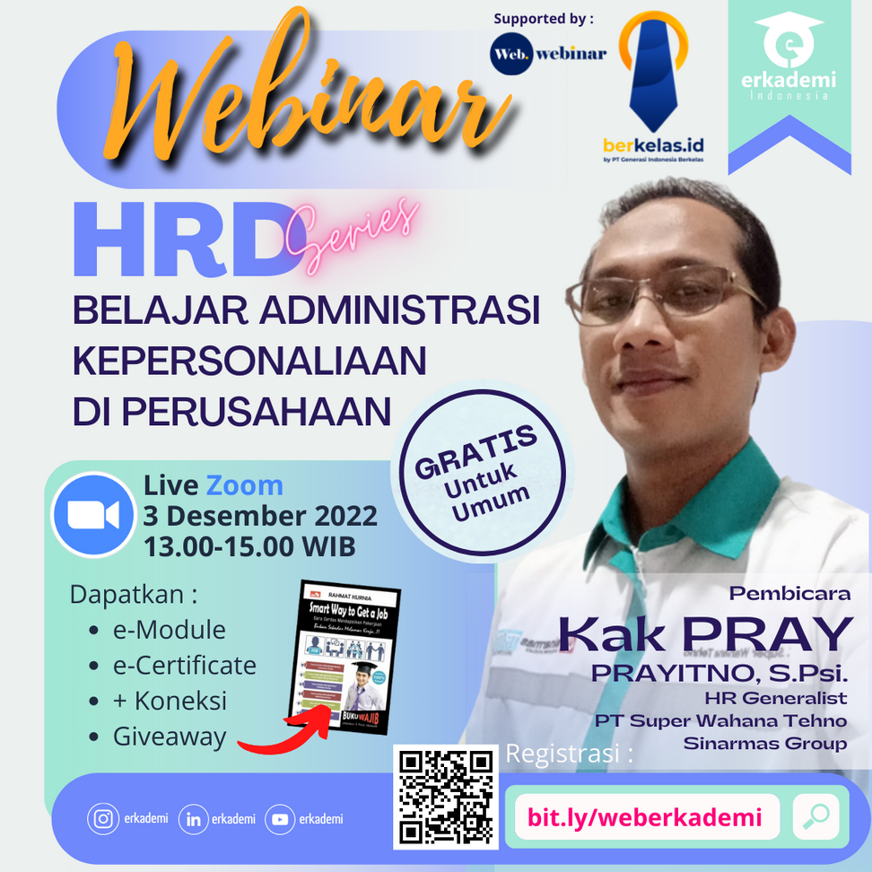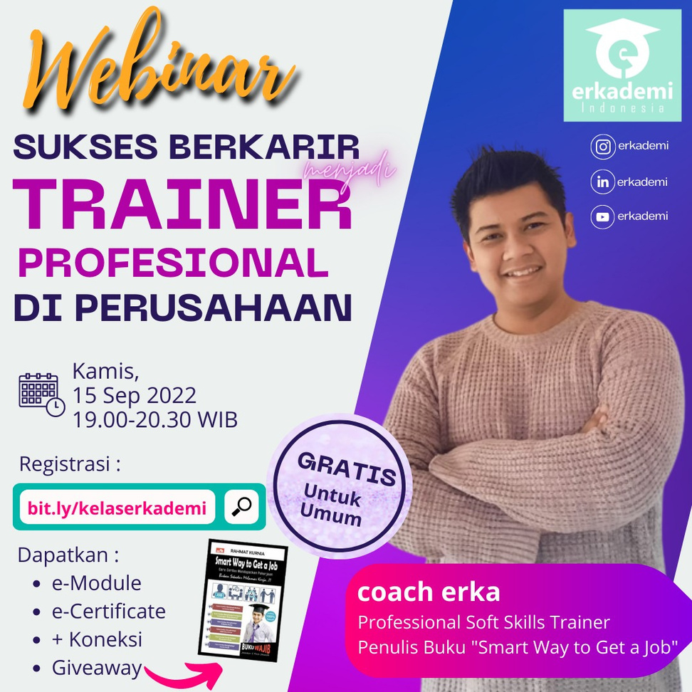 Program untuk para trainer, guru, akademisi, pengusaha, praktisi profesional atau siapapun yang ingin menjadi Pembicara/Speaker dalam kelas Webinar Gratis erkademi Indonesia, untuk mewakafkan serta membagikan ilmu dan pengalamannya yang bermanfaat bagi masyarakat Indonesia. Bersama kami, mari Jadikan Ilmumu sebagai Jejak Kebaikanmu.